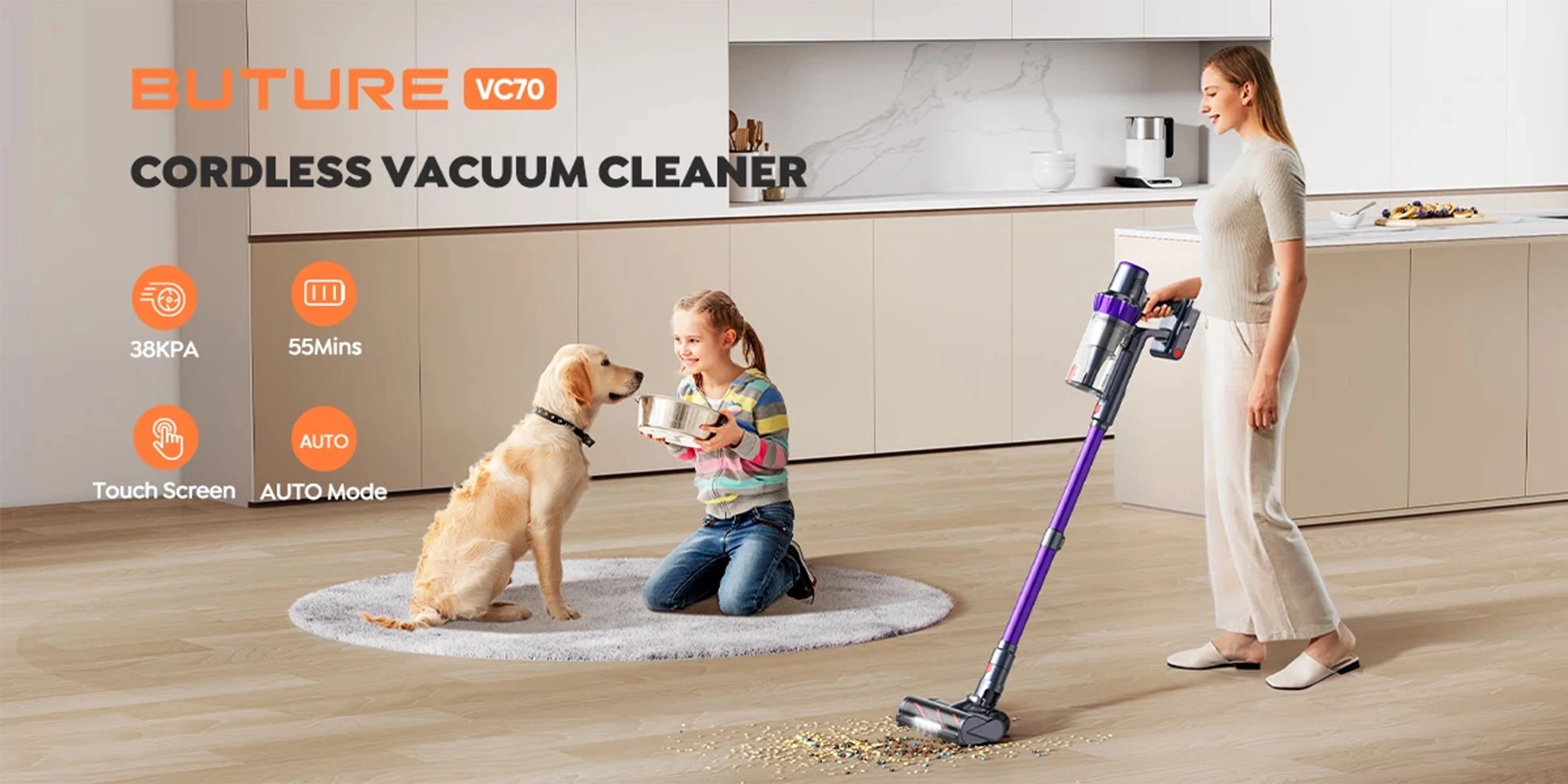 The Buture VC70 combines powerful suction with smart technology to make home cleaning easier than ever. This lightweight cordless vacuum features a 450W motor that effortlessly lifts dirt, dust, and pet hair from any surface.
