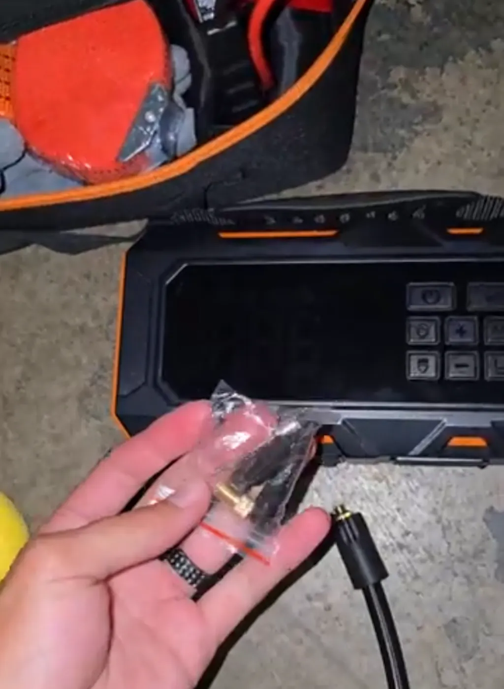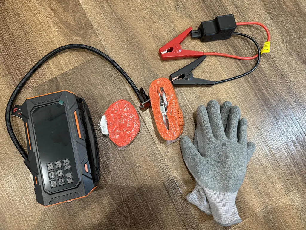 Buture Beta09 comes fully equipped with a jump starter, tire repair kit, USB-C fast charging cable, heavy-duty jumper cables, instruction manual, 4-piece nozzle set, air hose, insulated gloves, luggage tie-down, tow rope, 2-in-1 hook stone tool, and a protective emergency storage bag, keeping everything organized, accessible, and ready for use anytime.