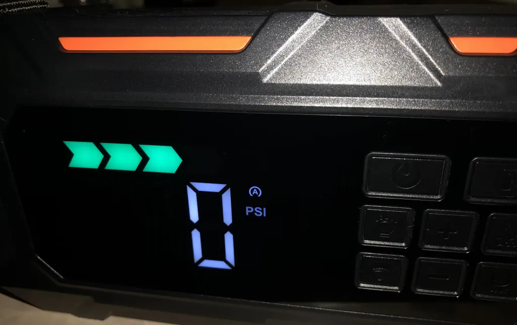 Buture Beta09 car jump starter with bright LED display showing real-time pressure, battery level, and inflation mode, 5 intelligent inflation modes for precise and easy operation.